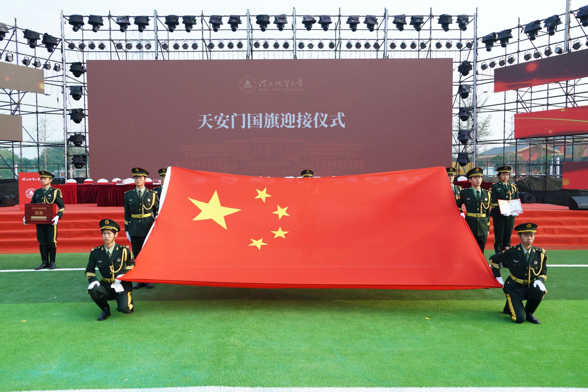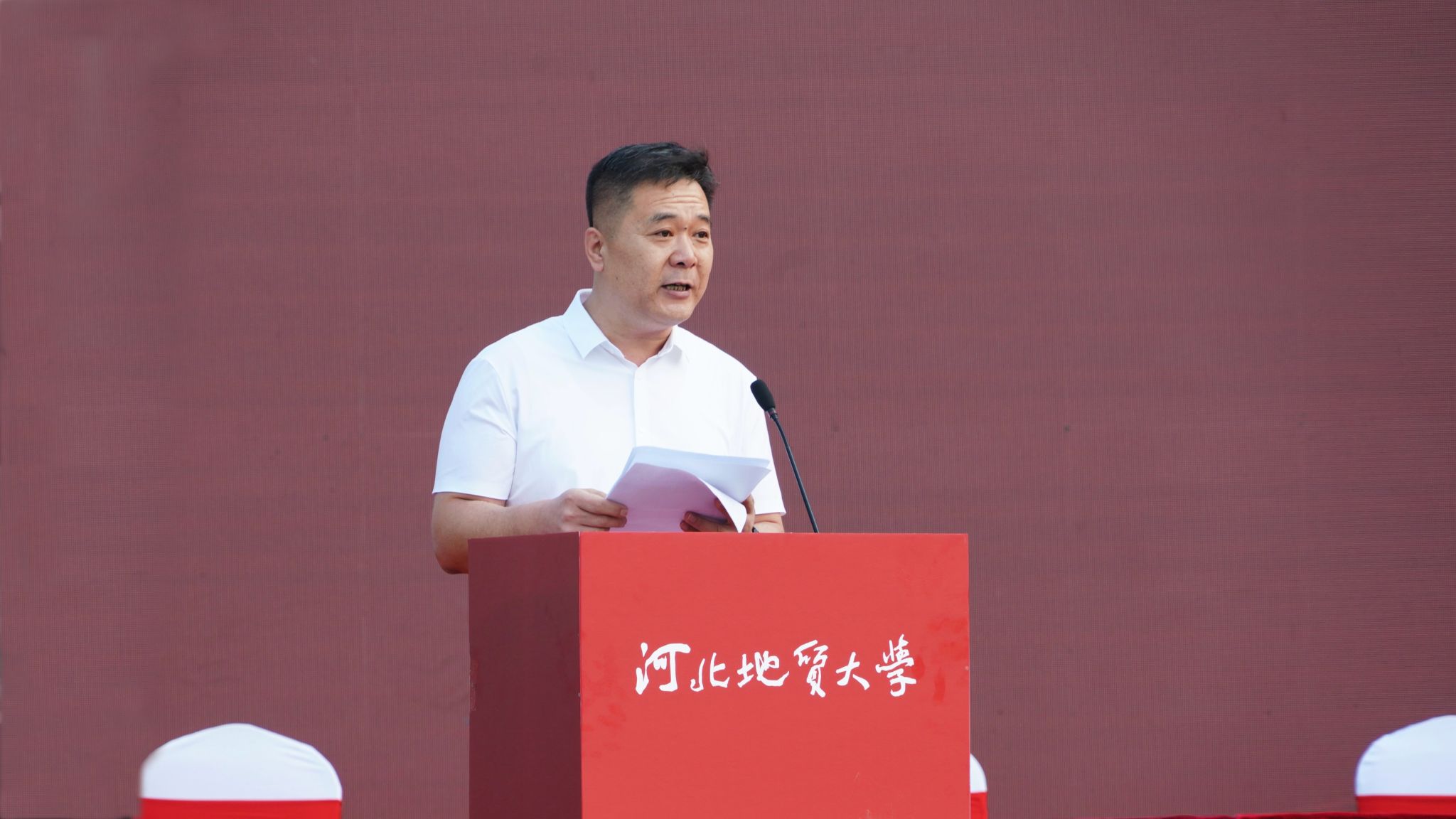 典礼上,校领导为新生代表佩戴校徽,标志着他们正式成为河北地质大学的一员。随后,和志强为2025级新生军训团授旗,并宣布军训正式启动。