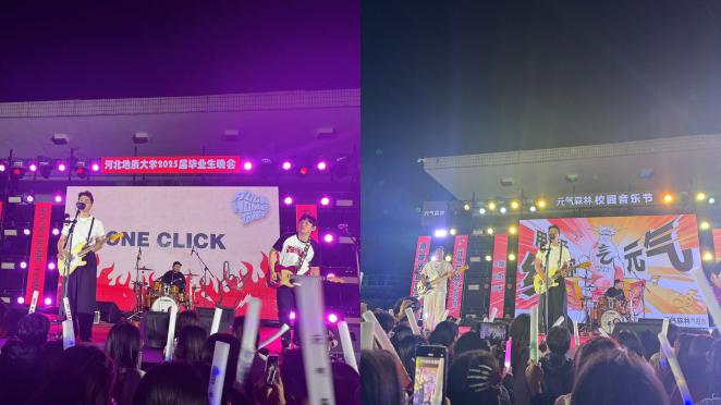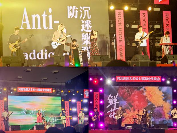 青春作伴,摇滚同行。6月15日晚,“正青春·向未来”摇滚进校园暨送毕业生晚会热力开演,来自石家庄市乐队释怀岛、ONE CLICK和河北地质大学校园乐队防沉迷、景源街26号齐聚校园,用激昂旋律点燃夏夜,为毕业生们送上一场难忘的音乐告别礼。乐队轮番献唱,他们将对校园的眷恋与摇滚的炽热完美融合,把对生活的感悟融入旋律,时而温柔倾诉、时而激情呐喊。青春共鸣,摇滚传递毕业祝福,激励毕业生带着摇滚般的热情与无畏,奔赴人生新旅程。