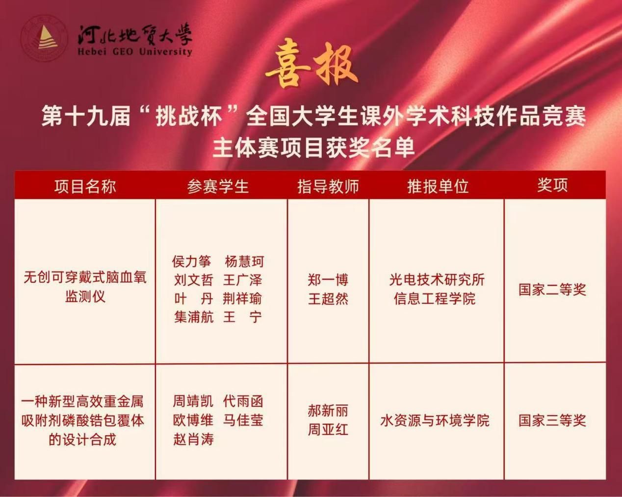 10月31日至11月4日,第十九届“挑战杯”全国大学生课外学术科技作品竞赛决赛在南京大学举行。经过激烈角逐,我校荣获主体赛国家二等奖1项(科技发明类作品)、三等奖1项(自然科学类作品),创下我校近年来参赛最佳成绩,并实现科技发明类作品在国赛中首次入围即获奖的突破。