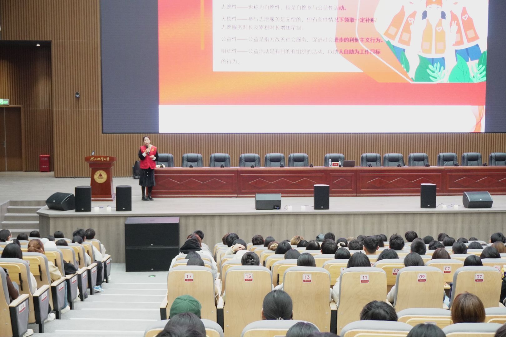 刘璐老师以《志愿服务组织与实施》为主题,结合自身多年志愿服务组织与管理经验,从志愿服务理念、队伍建设、礼仪规范、项目管理、风险防控等多个维度进行了系统讲解。她通过生动的案例解析和互动交流,深入浅出地阐述了志愿服务中的沟通技巧、组织流程与现场管理要点,为在场同学带来了一场内容丰富、实用性强的专业培训。